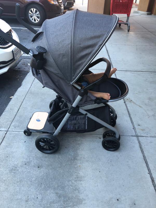 The removable board easily connects during set-up and folds away when not in use. The removable board easily connects during set-up and folds away when not in use. Evenflo Sibby Travel System Stroller Car Seat Ride-Along Board Oversized Storage Basket 3-Panel Canopy Multiple-Position Recline Easy to Fold and Store Materials Charcoal 47 out of 5 stars 511 ratings.